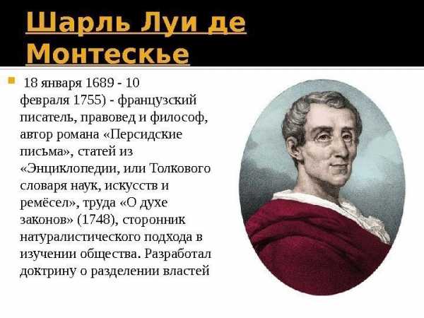 Шарль Луи де Монтескье 18 января 1689 — 10 февраля 1755) — французский писатель, правовед и философ, автор романа «Персидские письма» , статей из «Энциклопедии, или Толкового словаря наук, искусств и ремёсел» , труда «О духе законов» (1748), сторонник натуралистического подхода в изучении общества. Разработал доктрину о разделении властей
