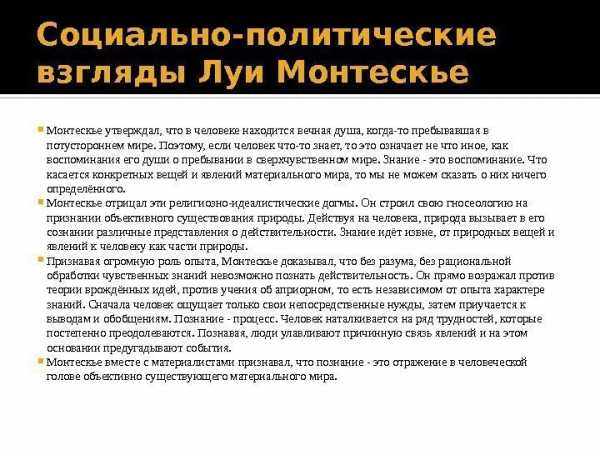 Социально-политические взгляды Луи Монтескье утверждал, что в человеке находится вечная душа, когда-то пребывавшая в потустороннем мире. Поэтому, если человек что-то знает, то это означает не что иное, как воспоминания его души о пребывании в сверхчувственном мире. Знание — это воспоминание. Что касается конкретных вещей и явлений материального мира, то мы не можем сказать о них ничего определённого. Монтескье отрицал эти религиозно-идеалистические догмы. Он строил свою гносеологию на признании объективного существования природы. Действуя на человека, природа вызывает в его сознании различные представления о действительности. Знание идёт извне, от природных вещей и явлений к человеку как части природы. Признавая огромную роль опыта, Монтескье доказывал, что без разума, без рациональной обработки чувственных знаний невозможно познать действительность. Он прямо возражал против теории врождённых идей, против учения об априорном, то есть независимом от опыта характере знаний. Сначала человек ощущает только свои непосредственные нужды, затем приучается к выводам и обобщениям. Познание — процесс. Человек наталкивается на ряд трудностей, которые постепенно преодолеваются. Познавая, люди улавливают причинную связь явлений и на этом основании предугадывают события. Монтескье вместе с материалистами признавал, что познание — это отражение в человеческой голове объективно существующего материального мира.
