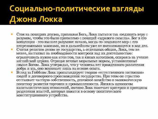 Социально-политические взгляды Джона Локка Стоя на позициях деизма, признавая Бога, Локк пытался так соединить веру с разумом, чтобы это было приемлемо с позиций «здравого смысла» . Бог в его концепции — это высшее разумное начало, когда-то создавшее мир с его непреложными законами, но в дальнейшем уже не вмешивающееся в ход дел. Считая религию делом не государства, а отдельных общин, Локк, тем не менее, настаивал на необходимости контроля над их деятельностью: ограничивать нужно как атеистов, так и явных католиков, опираясь на учение английской церкви. Отрицая вечные моральные нормы, установленные свыше Богом. Локк утверждал, что у человека нет врожденного различения добра и зла, оно возникает лишь на основе опыта. Вслед за Гоббсом Локк пропагандирует теорию «естественного состояния» людей и договорного происхождения государства. При этом он страстно отстаивает частную собственность, денежное хозяйство и экономическую политику развития торговли и промышленности. Являясь идеологом капиталистических отношений, именно Локк намечает критерии и принципы разделения властей, которые ложатся в основу политического конституционного устройства.