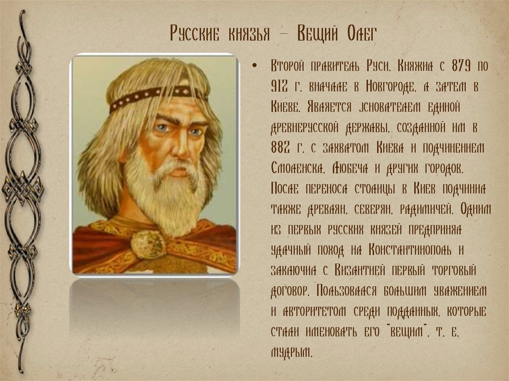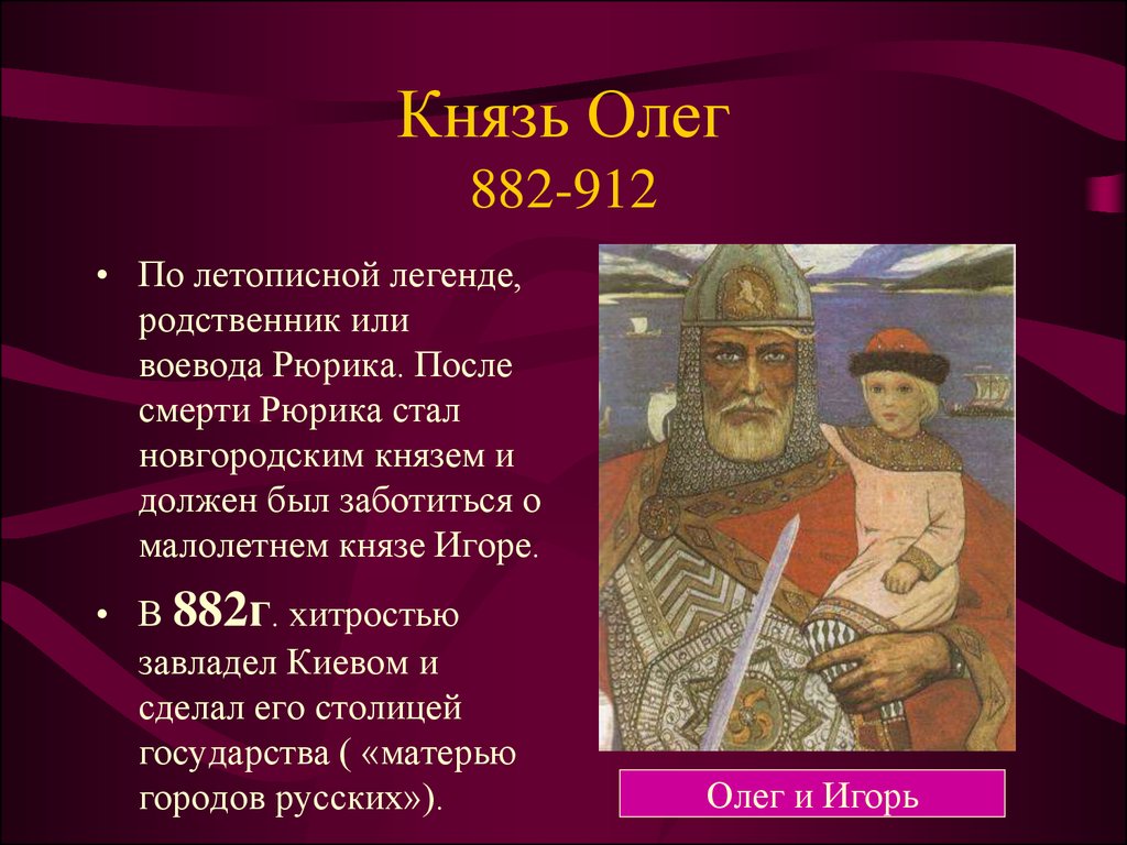 Современная история умалчивает истинный год, когда мог родиться будущий правитель Олег, известно лишь то, что после кончины Рюрика, примерно в 879 году, Олег принял в свои руки правление и всю ответственность от предыдущего правителя, его товарища и друга. Князь Олег был гениальным человеком по тому времени, он чудесно справлялся с военными обязанностями, был хорошим отцом, вел стратегическую политику, имел огромную смекалку и был талантливым дипломатом. За время своего правления он в многократном размере увеличил количество земельных владений, наладил множество контактов с другими государствами, подчинил к себе другие народы и нации, с гордостью расправлялся с врагами, а также научил этому всему своего последователя Игоря.