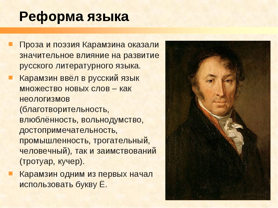 Главное новаторство Карамзина заключалось еще и в том, что он являлся подлинным реформатором русского языка.