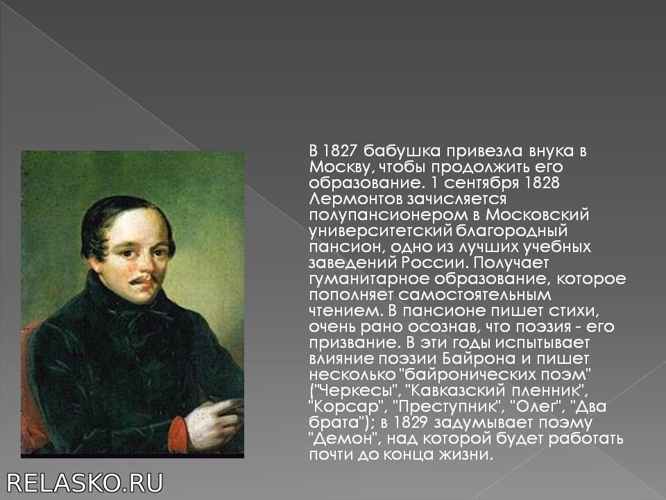 Он получает домашнее образование. В биографии Лермонтова начинается новый этап: он учится в университетском пансионе Москвы (1828–1830 гг.). Там были написаны первые его стихотворения.