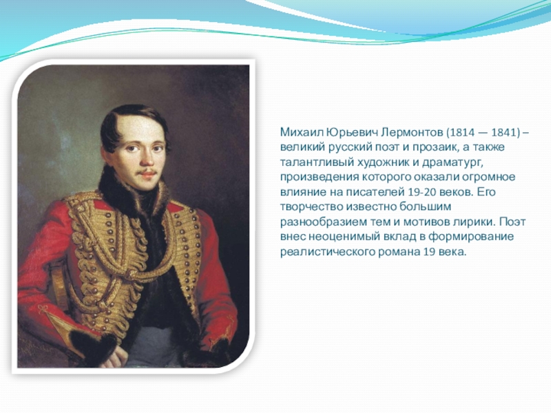 Михаил Юрьевич Лермонтов (1814–1841 гг.) – великий русский поэт и прозаик, а также талантливый художник и драматург, произведения которого оказали огромное влияние на писателей XIX–XX веков. Его творчество известно большим разнообразием тем и мотивов лирики. Поэт внес неоценимый вклад в формирование реалистического романа XIX века.