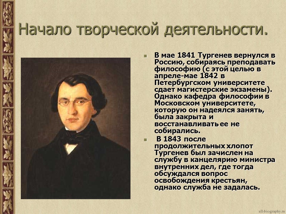 Тургенев находился под сильным влиянием Германии и хотел распространить идеи Просвещения в России. Он считал, что крепостное право в России должно быть отменено, и в произведениях Тургенева воплощены социальные, а не религиозные идеи реформаторского движения. С 1843 по 1845 год Тургенев работал в Министерстве внутренних дел.