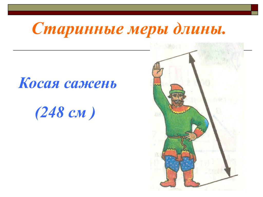 - Сажень косая = 248,5 см – расстояние от носка левой ноги до конца среднего пальца поднятой вверх правой руки.