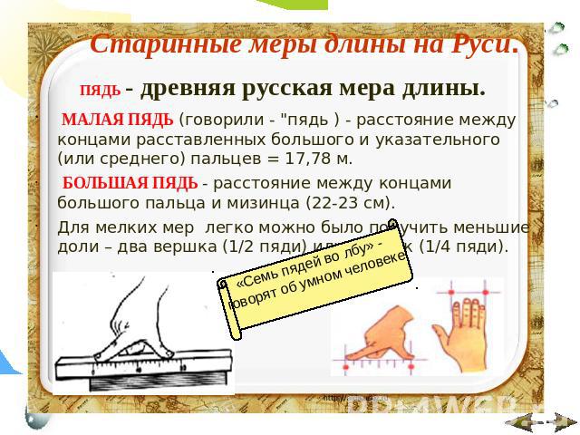 - Пядь (1 пядь = 23, 153 см – расстояние между концами большого пальца и мизинца).