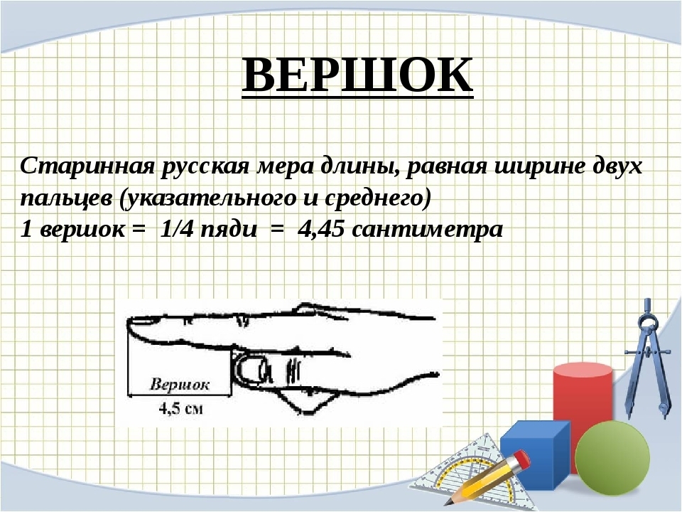 - Вершок (1 вершок = ¼ чети = 1/16 аршина = 1,75 дюйма = 44, 45 мм)