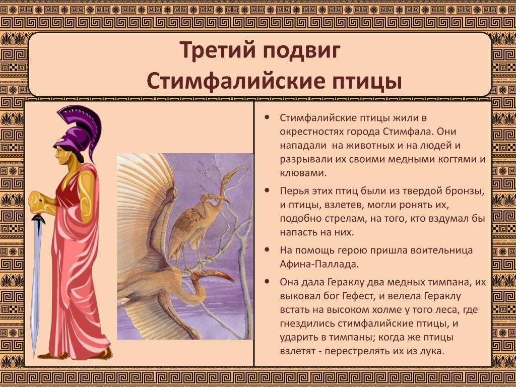 Сюжет. Третьим заданием Эврисфея стало уничтожение стимфалийских птиц. Они гнездились в Аркадии возле города Стимфала и стали настоящим бедствием для его жителей. Первые две птицы внезапно появились на берегах Стимфалийского озера. Они быстро размножились и очень скоро истребили все окрестные посевы и домашних животных. Местность практически превратилась в пустыню. Птицы представляли собой грозную силу: их когти и клювы были медными, а перья — бронзовыми. Птицы безжалостно убивали людей, раздирая их на куски. К тому же они могли сбрасывать бронзовые перья на сильных противников. Эврисфей сделал вид, что ему стало жалко жителей Стимфала и он хочет им помочь избавиться от напасти.