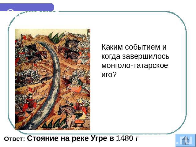 На это решился Ахмед-хан в 1480-ом году. Двигался он медленно, откармливая коней в междуречье Оки и Дона, и это позволило Ивану Третьему вовремя собрать войско и расположить его вдоль Оки на линии Серпухова и Тарусы, особо укрепив места бродов.