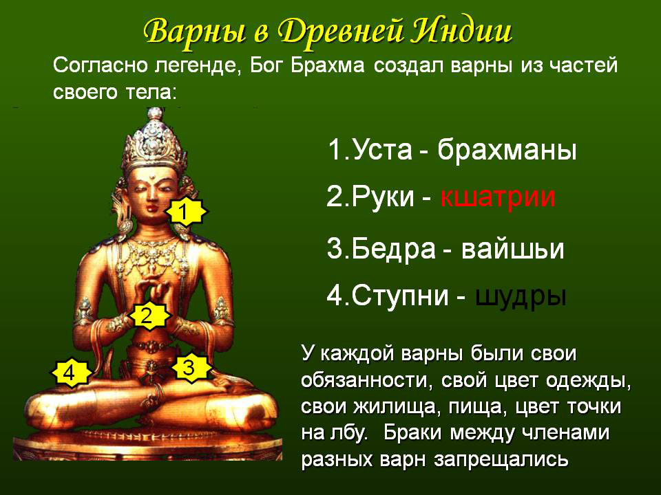 При рассмотрении второговопроса необходимо раскрыть сущность варнового строя. В Индии было особенно жёсткое, обусловленное исключительно рождением разделение населения на четыре варны: брахманов, кшатриев, вайшьев, шудр. Определите, каким образом объяснялось происхождение каждой из варн, выделите основную дхарму для всех варн и дхарму каждой варны. Обратите внимание на неравноправие представителей разных варн в гражданских делах, на зависимость назначения наказаний от варны потерпевшего и преступника (V111, 123, 124, 267, 268; 1Х, 152, 153).