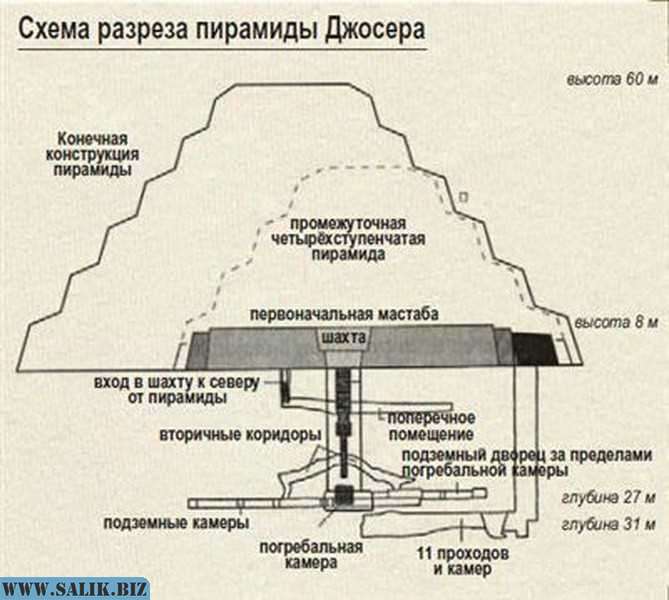 Под ступенчатой пирамидой вьется изумительное множество туннелей и камер, в центре которых находится 9Шахта глубиной 0 футов (28 м), на дне которой находится погребальная камера царя Джосера. Мумия царя Джосера исчезла, но работы по консервации в погребальной камере выявили 32 фрагмента гранитного саркофага царя, написал в своей статье Захи Хавасс, бывший министр древностей Египта.