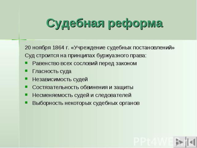 Таким образом, признавая важность реформы судебной системы, кадеты и в этой сфере связывали успех с изменениями общих условий современности, с приданием законодательным учреждениям реальной власти и поэтому критически воспринимали любое предложение, исходившее от правительства.