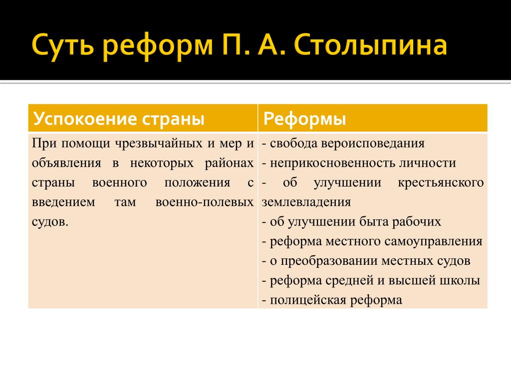 Самой смелой мерой Столыпина была его программа крестьянской реформы, которая позволяла, а иногда и принуждала к распаду общин, а также к установлению полной частной собственности.
