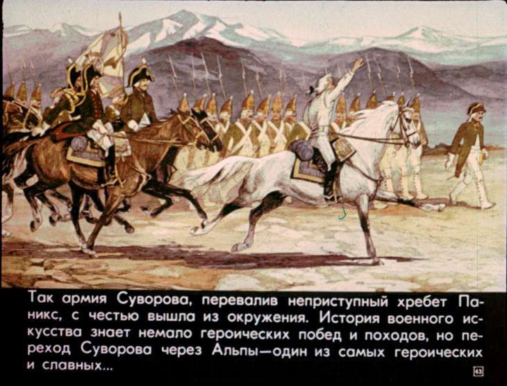 Ну и, наконец, без альпийского похода не состоялось бы побед 1812—1815 годов, то есть решающих побед над наполеоновской армией: Суворову удалось развеять миф о непобедимости французов, поскольку он разбил их армии в трех сражениях. А ведь французы действительно считались тогда непобедимыми. И уже в 1812 году ученики Суворова, столкнувшись с армией Наполеона, не дрогнули и выстояли — у них был победный опыт 1799 года.