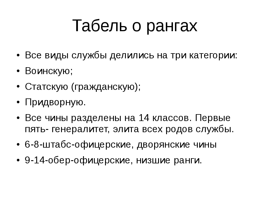 Новая система чинов и званий Российской империи имела не IX, как в Московском государстве, а XIV классов. Соответственно, и продвижение по этой лестнице, и скорость получения более высоких чинов менялись и требовали от претендентов существенно больших усилий. Высшим чином I класса в петровской «Табели о рангах» стал: у военных – генерал-фельдмаршал, а у гражданских – канцлер. При этом высший придворный чин – обер-маршал – относился только ко II классу; в первоначальном варианте табели о рангах туда же относился и канцлер, то есть министр иностранных дел, но Петр I внял советам своего сподвижника Андрея Остермана и поднял канцлерский чин на класс выше. К низшему, XIV классу у военных относился чин фендрика (позднее — прапорщика) в сухопутных войсках, инженерского фендрика в артиллерии и корабельного комиссара во флоте, у гражданских – коллегии-юнкера, а у придворных – гоф-секретарь и приравненные к нему.![]()