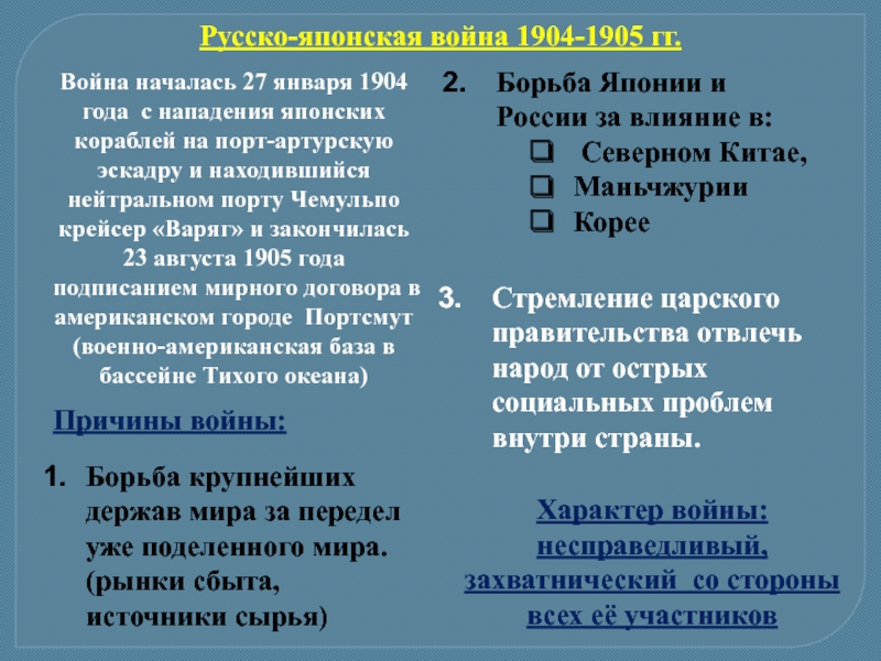 К лету 1905 г. — Япония стала явно ощущать нехватку материальных и людских ресурсов и обратилась за помощью к США, Германии, Франции. США выступают за мир. Мир подписан в Портсмуте, нашу делегацию возглавлял С.Ю.Витте