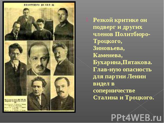Мы против того, чтобы Секретариат, который фактически сочетает в себе и политику, и организацию, стоял над политическими органами. Мы за то, чтобы наше руководство было организовано внутри так, чтобы Политбюро было фактически полноправным… Я пришел к выводу, что товарищ Сталин не может выполнять роль объединителя большевистского высшего командования» 9.0012