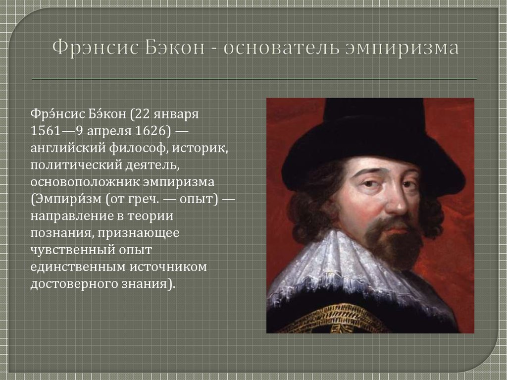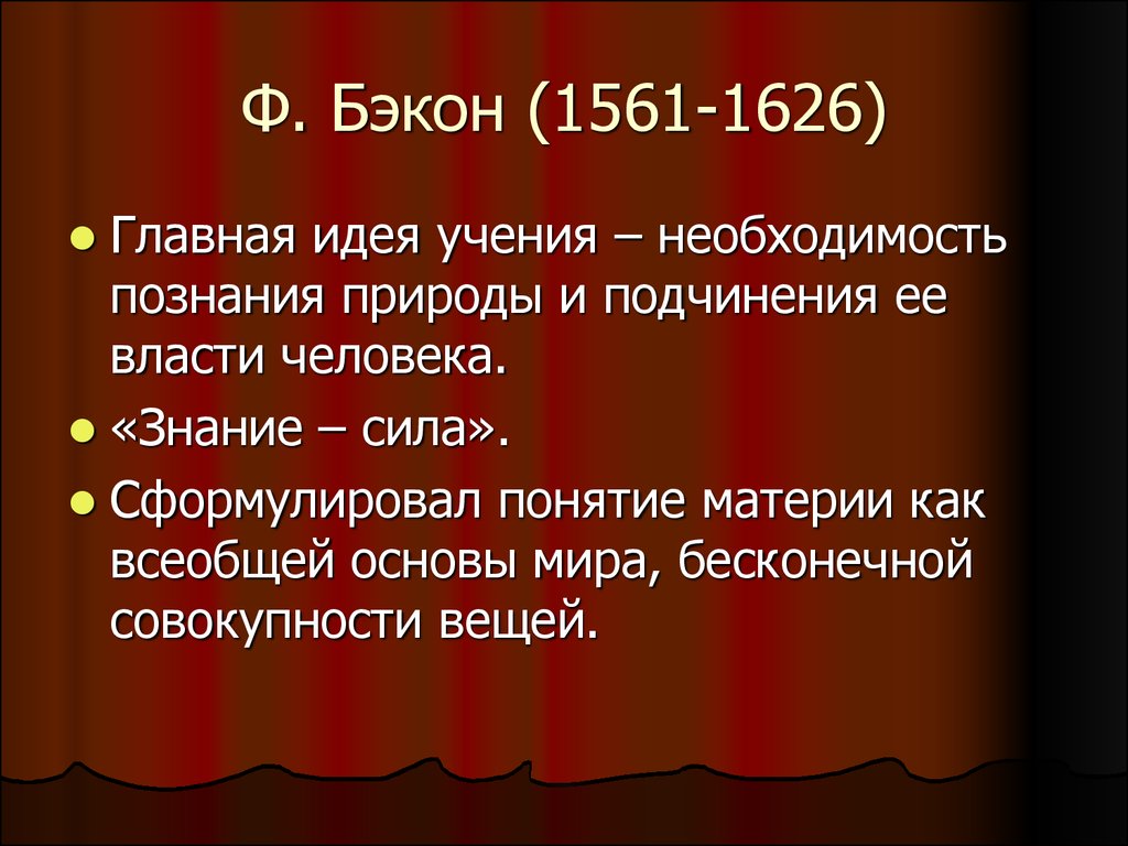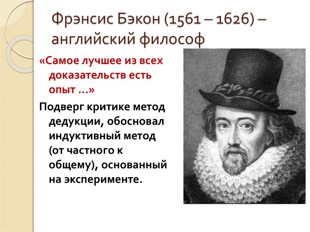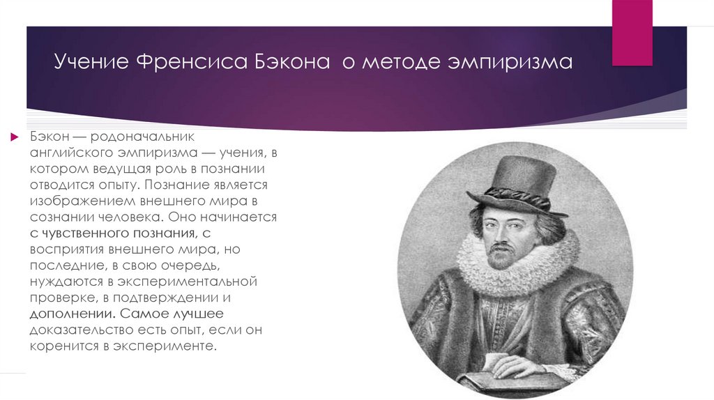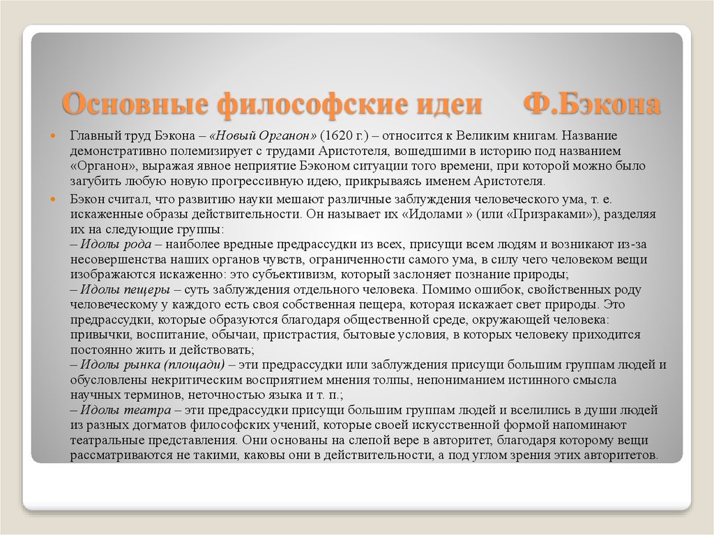 Но, как бы то ни было, Бэкону принадлежит то громадное историческое значение, что его трактаты возбуждали к изучению природы, разрушали схоластику. Он действительно отец сенсуалистической и эмпирической философии Нового времени.