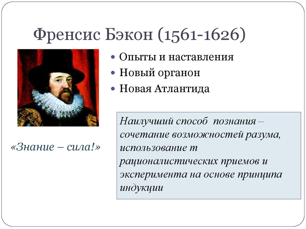 Почти все свои ученые труды Бэкон писал по-латыни, а те немногие, которые писал на английском языке, сам переводил на латинский. Во всех его произведениях неизменно виден очень сильный ум, богатый мыслями, чрезвычайно логичный. Не все его понятия основательны. Недостаток нравственного чувства мешал Бэкону справедливо оценивать возвышенные стремления людей. Он не понимает лирической поэзии, умея ценить только изображение внешней природы; в естествознании, которое ставил выше всех других отделов науки, он не сделал никаких открытий. Но ему принадлежит заслуга приведения всех отраслей звания в систематический порядок. Фрэнсис Бэкон доказывал, что источник всех верных сведений – наблюдение и опыт, за это его и называют отцом новой философии, основывающейся на опыте.