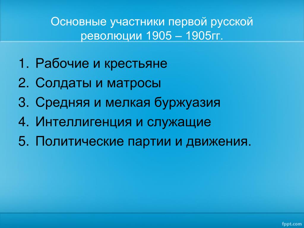 Несмотря на разночинность и количество представленных слоев, принявших участие в Первой русской революции, следует отметить, что практически сразу она была подхвачена организованными партиями или другими организациями, ставившими своими целями борьбу с самодержавием.