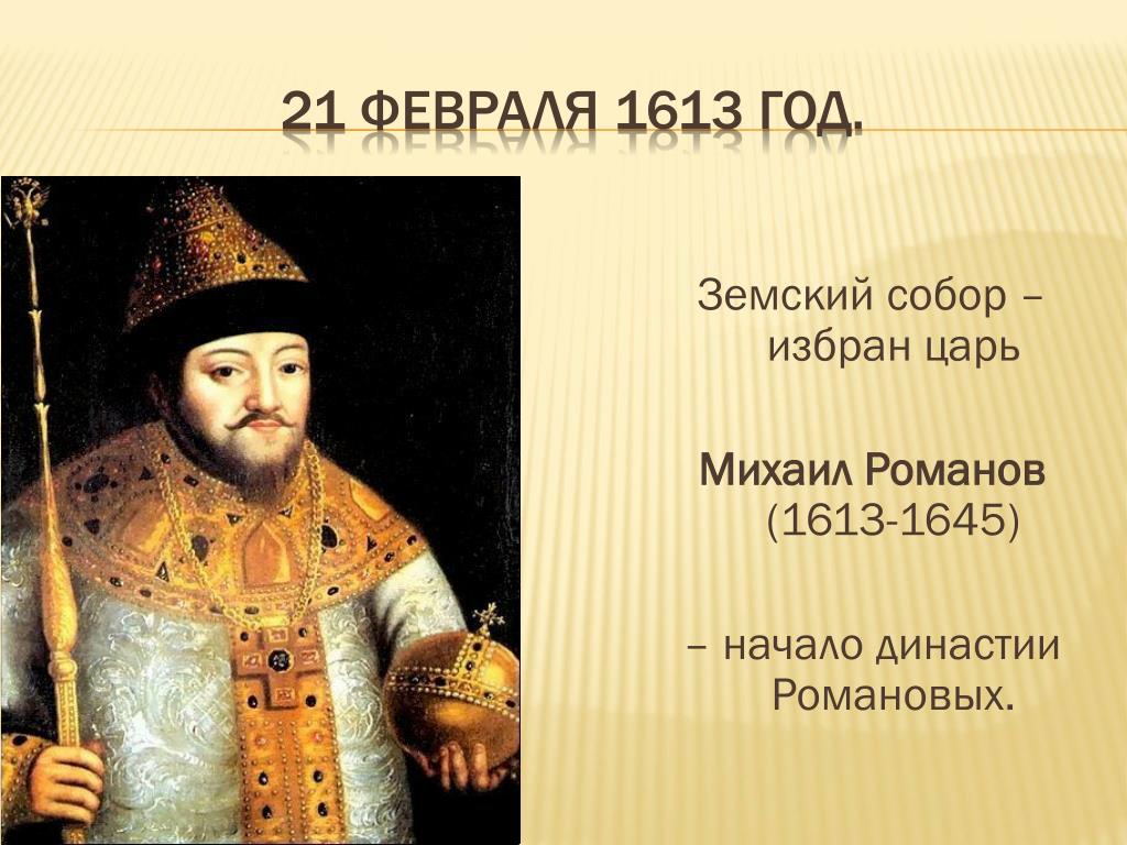 21 февраля (3 марта) 1613 года собравшийся в Москве Земский собор избрал на московский престол шестнадцатилетнего Михаила Федоровича Романова.