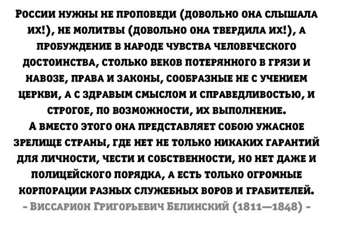 класс дает, и говорит, что он не должен подчиняться желанию высшего класса, чтобы жить хорошей жизнью, в то время как другие все еще страдают.0004 Я полностью согласен с тем, что говорит Белинский в этом письме, я чувствую, что он сильно разочарован тем фактом, что такой человек, как Гоголь, полностью изменил свои взгляды на российскую политику и социальный статус-кво. Белинский называл Гоголя «надеждой, гордостью, славой страны, одним из великих вождей на пути к сознанию, развитию и прогрессу». Кажется, Белинский очень уважал Гоголя и все его произведения до этого момента, и вдруг печать этой новой книги изумляет его. Это почти сравнимо с ребенком, который боготворит спортсмена и живет моралью, которую проповедует этот спортсмен; «усердно работать, усердно учиться и быть хорошим человеком» только для того, чтобы узнать, что их кумир не делал ничего из этого, чтобы добраться туда, где они сейчас. Вместо этого они узнают, что этот спортсмен сжульничал на пути тяжелой работы, что-то подобное может полностью разрушить детские надежды и мечты, но, как ребенок не желает верить этим слухам о своем спортсмене, так и Белинский предлагает оправдания почему Гоголь мог напечатать это произведение.