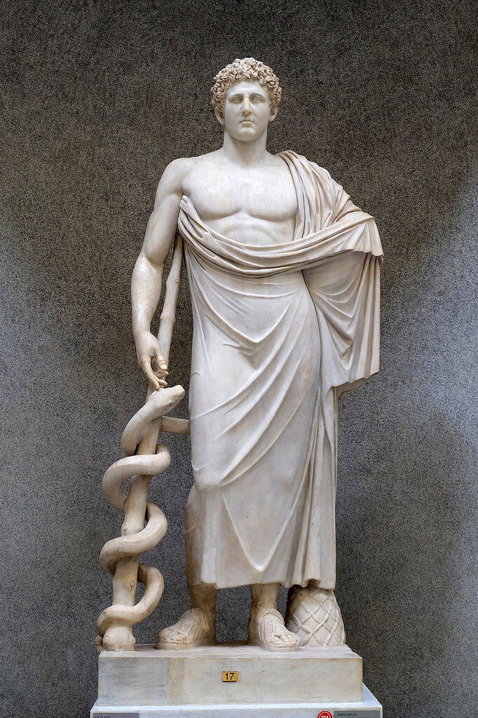 Асклепий, греко-римская мраморная статуя C1-2 вв. н.э., Государственный Эрмитаж Асклепий — древнегреческий бог медицины, сын Аполлона. Асклепий представляет лечебный аспект медицинского искусства. Он также был олицетворением идеального врача, он был богом медицины и врачевания, а также обладал силой воскрешать людей из мертвых.