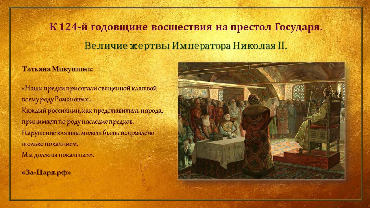 Произошло это в Крыму, в Ливадии, в царском имении близ Ялты. В этот же день присягу императору принесли чиновники, придворные и войска.