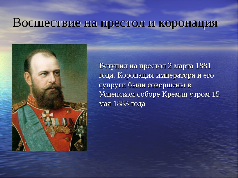 Восшествие на престол Николая II20 октября 1894 года Александр III скончался после болезни. Коронация нового императора и его супруги состоялась только через два года, 14 мая 1896 года. Во время проведения коронации произошла чудовищная Ходынская трагедия. Плохая организация народных гуляний в честь коронации императора привела к давке, погибло 1379 человек, несколько сотен получили увечья.