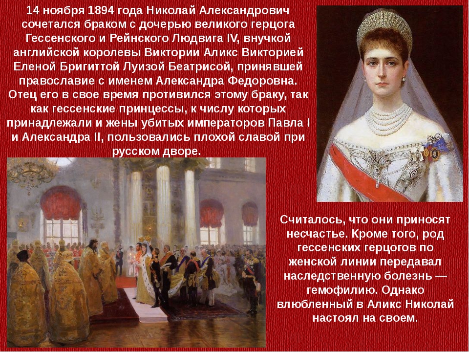14 (26) ноября в Большой церкви Зимнего дворца новый император сочетался браком с принцессой Алисой Гессен-Дармштадтской, ставшей в православии Александрой Фёдоровной.