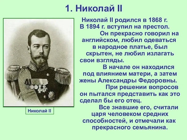 г. — Император Николай II был обычным человеком своего времени, и у него были типичные для своего времени интересы.Он был заядлым автомобилистом, фотографом, теннисистом, любителем кино и так далее. Он построил бассейн в Зимнем дворце. Он был нормальным аристократом своего времени, но без аристократической чепухи и без отклонений, колебаний и тирании, которые иногда были характерны для аристократии.