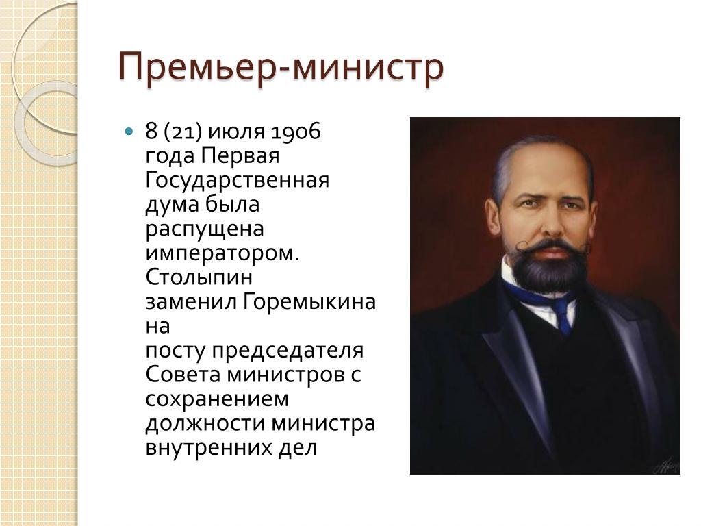Административный талант Столыпина был замечен императором Николаем II, который дважды выразил ему личную благодарность за проявленное усердие. В апреле 1906 г. Столыпин был назначен министром внутренних дел; с 8 (21) июля 1906 г. он совмещал этот пост с должностью председателя Совета министров Российской империи.