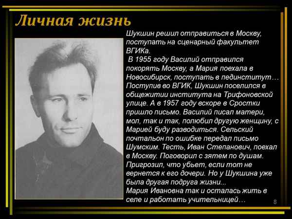 Жизненный путь Василия был сложен и наполнен потрясениями. Шукшин стойко переносил все, что выпадало на его долю. Он открыл в себе талант к писательству, нашел свою аудиторию. Сделал первые успехи в режиссуре, будучи студентом ВГИКа. Он покорил сердца зрителей своими картинами. Его успех развивался стремительно, но всеми любимый Василий ушел из жизни внезапно.