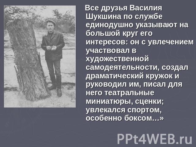 В 1949 году поступил на флот. В этом качестве он служил в городе Балтийске, а затем на Черном море. Примечательно, что именно в армейские годы Василий Шукшин впервые увлекся творчеством. В свободное время он писал различные стихи и рассказы, которые потом читал своим коллегам.