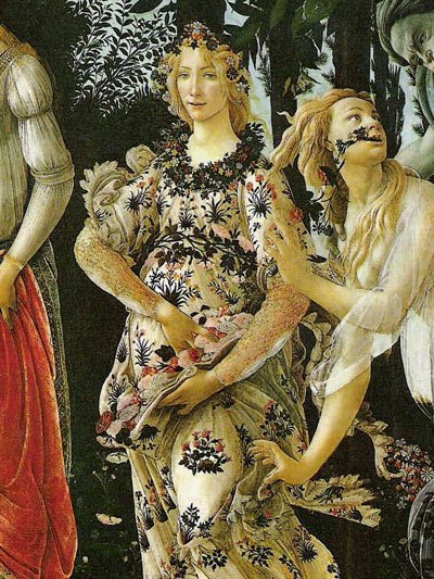 Весна (Флора) предстала на картине в образе юной девы в наряде, украшенном цветами.