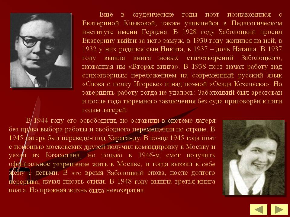Николай Заболоцкий с Екатериной КлыковойВо время заключения Екатерина поддерживала его перепиской как могла, и сама поднимала детей. Но в 1955 году женщина ушла к писателю Василию Гроссману, а у Николая Алексеевича случился роман с Натальей Роскиной. Но их расставание продлилось только три года. Екатерина вернулась к мужу, и осталась с ним до конца дней.