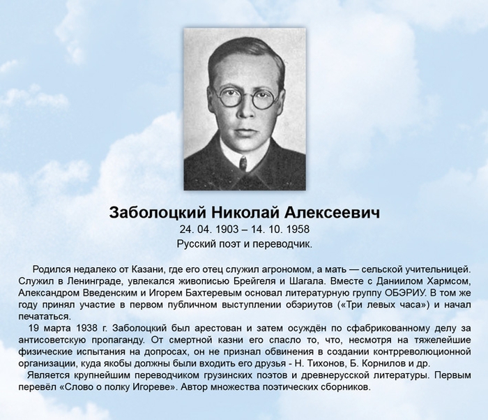 Николай Алексеевич Заболоцкий — советский поэт-философ, переводчик, являлся членом Союза писателей СССР, был репрессирован в 1938 году, его реабилитировали посмертно в 1963 году.