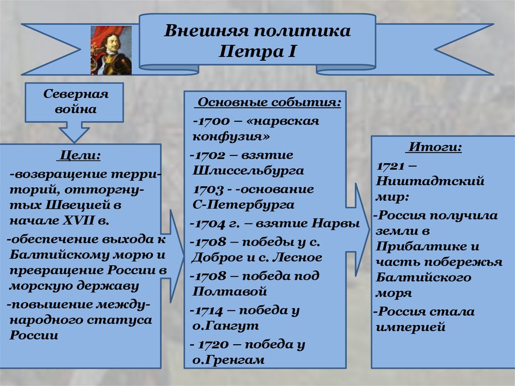 | Присоединение земель, ранее относящихся к Древнерусскому государству | Россия расширила северо-западные границы за счет присоединения Лифляндии, Эстляндии и Ингерманландии. Задача выполнена частично, поскольку вернуть все земли Древнерусского государства не удалось. |