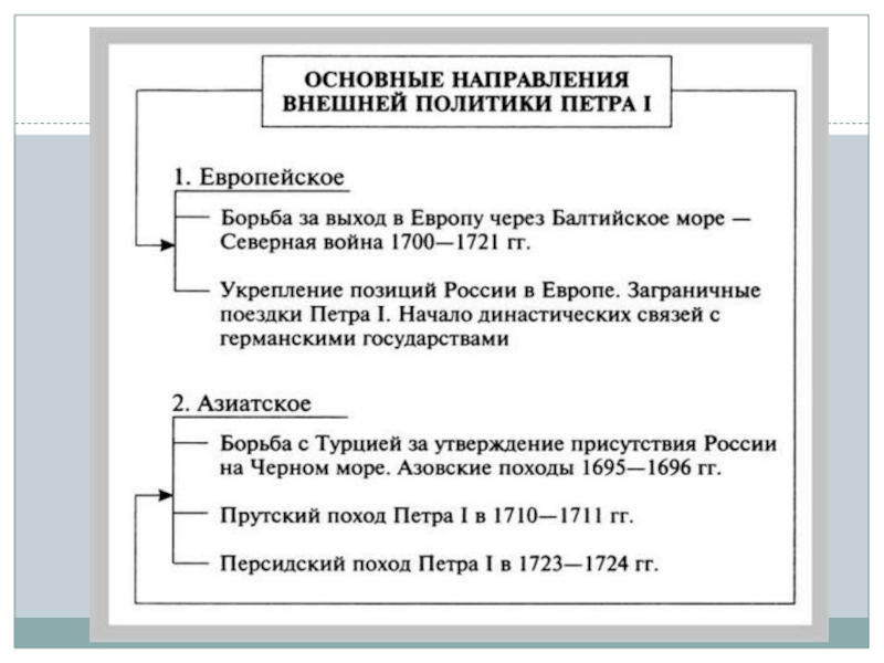 Иными словами можно говорить о том, что внешняя политика Петра 1 разделяется на Восточное и Западное направление. Восточное направление предполагало расширение за счёт выхода к Черному морю, а также расширение границ России по Каспийскому морю. Западное направление предполагала выход к Балтийскому морю. Рассмотрим основные цели и задачи, которые преследовались в каждом из этих направлений, а также основные события, которые сопровождали действия Петра 1 на Востоке и на Западе.