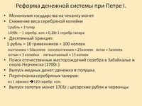 Итоги правления Петра: значительный экономический рост, расширение территории государства, создание боеспособной армии и флота, рост международного авторитета России с одной стороны. Ужесточение крепостного права, усиление налогового гнета, складывание абсолютной монархии с другой.