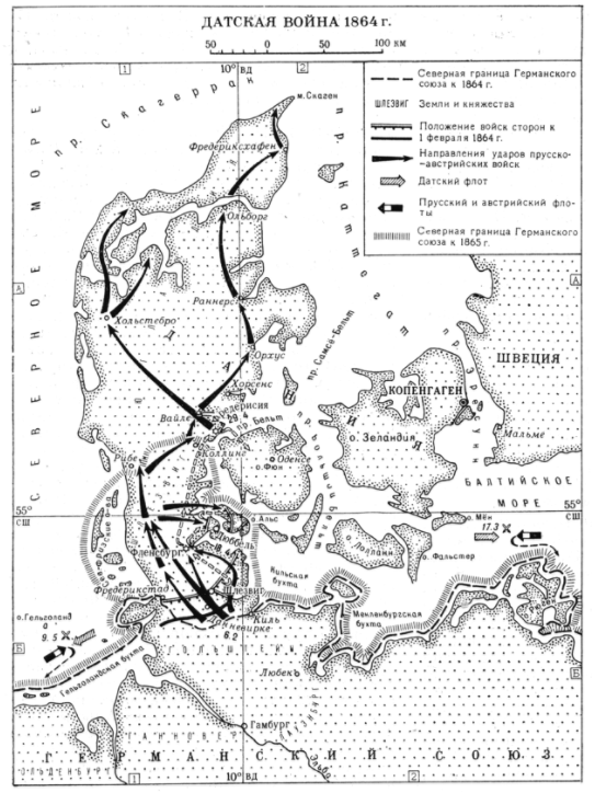 войска перешли в новое наступление и 29 июня захватили о. Альс, а к 14 июля завершили оккупацию всего п-ова Ютландия. 16 июля было заключено второе перемирие, окончившееся подписанием 30 окт. Венского мира 1864, по к-рому Дания теряла Шлезвиг, Гольштейн и Лауэнбург, что создало предпосылки для образования в дальнейшем однородного нац. дат. гос-ва. Для Германии Д. в. была первой в ряду, войн, обеспечивших военно-юнкерским путем объединение мелких нем. гос-в в единое герм. гос-во во главе с монархич. Пруссией.Лит.: Энгельс Ф., Роль насилия в истории, К. Маркс и Ф. Энгельс, Соч., 2 изд., т. 21, с. 419-79; Блом М. О. фон, Война 1864 года в Дании, СПБ, 1895; Чудовский В. Н., Война sa Шлезвиг-Гольштейн 1864 года, СПБ, 1866; Роотс Л., Шлезвиг-Гольштинский вопрос и политика европ. держав в 1863-1864 гг., Тал., 1957.