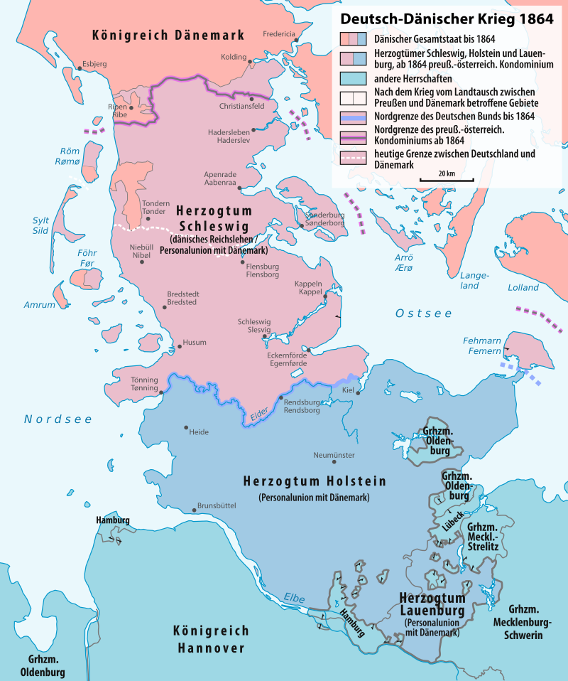 В кон. 1863 в Дании была принята новая конституция, по которой Шлезвиг объявлялся её частью. Нарушение междунар. соглашения, а также членство Гольштейна и Лауэнбурга в Герм. союзе дали повод последнему начать войну против Дании. В дек. 1863 саксонско-ганноверские войска вторглись на территорию герцогств. Против Дании выступила также Австрия, стремившаяся не допустить чрезмерного усиления Пруссии в Германии. 16.1.1864 Австрия и Пруссия потребовали от Дании отменить пункт конституции, касающийся Шлезвига. После отклонения этого ультиматума австро-прус. войска вошли в Шлезвиг и к сер. июля 1864 заняли весь п-ов Ютландия. 30 окт. в Вене был подписан мирный договор, по которому Дания уступила Пруссии и Австрии Шлезвиг, Гольштейн и Лауэнбург. Окончательно вопрос управления ими был урегулирован Гаштейнской конвенцией 1865.