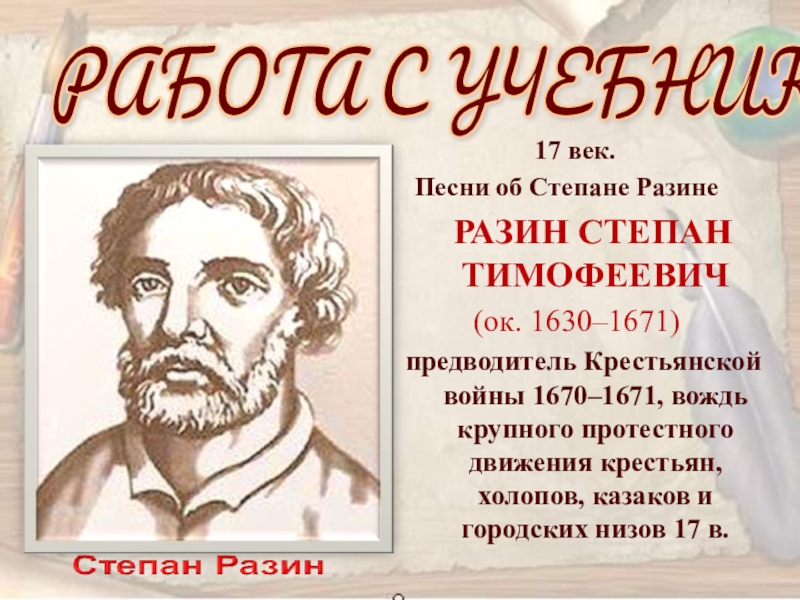 Восстание под руководством Степана Разина в 1670–1671 годах, в отличие от его предыдущих походов, уже носило остро социальный характер, и многие историки называют «крестьянской войной», поскольку население Дона и Поволжья выступало против царской власти и крепостное право, борьба против засилья власти и бессилия крестьянства…