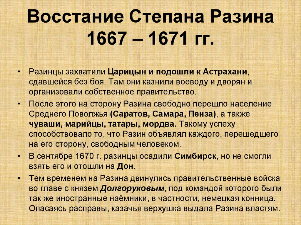 1 этап — «Поход за зипунами» 1667 — 1669 гг. 1667 г. — Поход казаков и беглых крестьян во главе с Разиным с Дона на Волгу и Каспийское море. Захват торговых караванов русских и персидских купцов. Захватили Яицкий городок, изгнали царских стрельцов, сделали опорным пунктом. 1668 — 1669 гг. — Поход на восточное побережье Каспийского моря (от Дербента до Баку). Победа над флотом персидского хана. Возвратились на Дон с богатой добычей и обосновались в Кагальницком городке. 2 этап — «Антикрепостническое выступление» 1670-1671 гг. 1670 г., апрель — июль — Поход Разина на Волгу, который имел явно антиправительственный характер (приняли участие различные слои населения, и народы). 1670 г., весна — Взятие казаками Царицына (сейчас это Волгоград), Камышина и Черного Яра. Начало крестьянской войны на Руси. 1670 г., лето — Штурм и овладение Астраханью (22 июня), чему спопсобствовал переход стрельцов на сторону Разина. Казнь восставшими воеводы И.С. 1670 г., август — сентябрь — Движение восставших из Астрахани вверх по Волге. Взятие без боя Саратова и Самары. Восстание охватило громадную территорию — от низовьев Волги до Нижнего Новгорода и от Слободской Украины до Заволжья. 1670 г., осень — 30-тысячная армия, после осмотра царя Алексея Михайловича, выдвинулась на подавление восстания 1670 г., сентябрь — Осада повстанцами Симбирска, где развернулись решающие сражения. 1670 г., 1 октября — Снятие осады Симбирска. Поражение Степана Разина (его 20-тысячной армии) и уход его с отрядом казаков на Дон. 1671 г., 14 апреля — захват С. Разина казацкой старшиной и выдача его царским властям. 1671 г., 6 июня — казнь Степана Разина в Москве на Красной площади, предварительно пытав его. 1671 г., осень — сражение отдельных отрядов постанцев с царскими войсками и окончательное подавление восстания. |