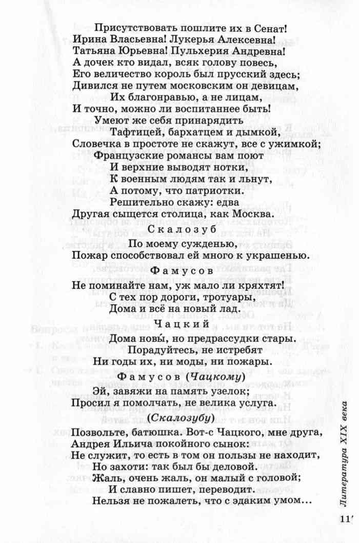 Фамусов: - Позвольте баютшка, вот Чацкого, мне друга, Андрея Ильича покойного сынок. Он не служит, ну, то есть он пользы не находит, а захоти - так был бы деловой. Жаль, очень жаль. Он малый с головой и славно пишет, переводит. Нельзя не пожалеть, что с этаким умом... Чацкий: - Нельзя ли пожалеть о ком-нибудь другом? И похвалы мне Ваши досаждают. Фамусов: - Не я один, все также осуждают. Чацкий: - А судьи кто? - За древностию лет К свободной жизни их вражда непримирима, Сужденья черпают из забытых газет Времен Очаковских и покоренья Крыма; Всегда готовые к журьбе, Поют все песнь одну и ту же, Не замечая об себе: Что старее, то хуже. Где, укажите нам, отечества отцы, Которых мы должны принять за образцы? Не эти ли, грабительством богаты? Защиту от суда в друзьях нашли, в родстве, Великолепные соорудя палаты, Где разливаются в пирах и мотовстве, И где не воскресят клиенты-иностранцы Прошедшего житья подлейшие черты.Да и кому в Москве не зажимали рты Обеды, ужины и танцы? Не тот ли, вы к кому меня еще с пелен, Для замыслов каких-то непонятных, Дитей возили на поклон? Тот Нестор негодяев знатных, Толпою окруженный слуг; Усердствуя, они в часы вина и драки И честь и жизнь его не раз спасали: вдруг На них он выменил борзые три собаки!!! Или вон тот еще, который для затей На крепостной балет согнал на многих фурах От матерей, отцов отторженных детей?! Сам погружен умом в Зефирах и в Амурах, Заставил всю Москву дивиться их красе! Но должников не согласил к отсрочке: Амуры и Зефиры все Распроданы поодиночке!!! Вот те, которые дожили до седин! Вот уважать кого должны мы на безлюдьи! Вот наши строгие ценители и судьи! Теперь пускай из нас один, Из молодых людей, найдется - враг исканий, Не требуя ни мест, ни повышенья в чин, В науки он вперит ум, алчущий познаний; Или в душе его сам Бог возбудит жар К искусствам творческим, высоким и прекрасным, - Они тотчас: разбой! пожар! И прослывет у них мечтателем! опасным!! - Мундир! один мундир! он в прежнем их быту Когда-то укрывал, расшитый и красивый, Их слабодушие, рассудка нищету; И нам за ними в путь счастливый! И в женах, дочерях - к мундиру та же страсть! Я сам к нему давно ль от нежности отрекся?! Теперь уж в это мне ребячество не впасть; Но кто б тогда за всеми не повлекся? Когда из гвардии, иные от двора Сюда на время приезжали, - Кричали женщины: ура! И в воздух чепчики бросали!