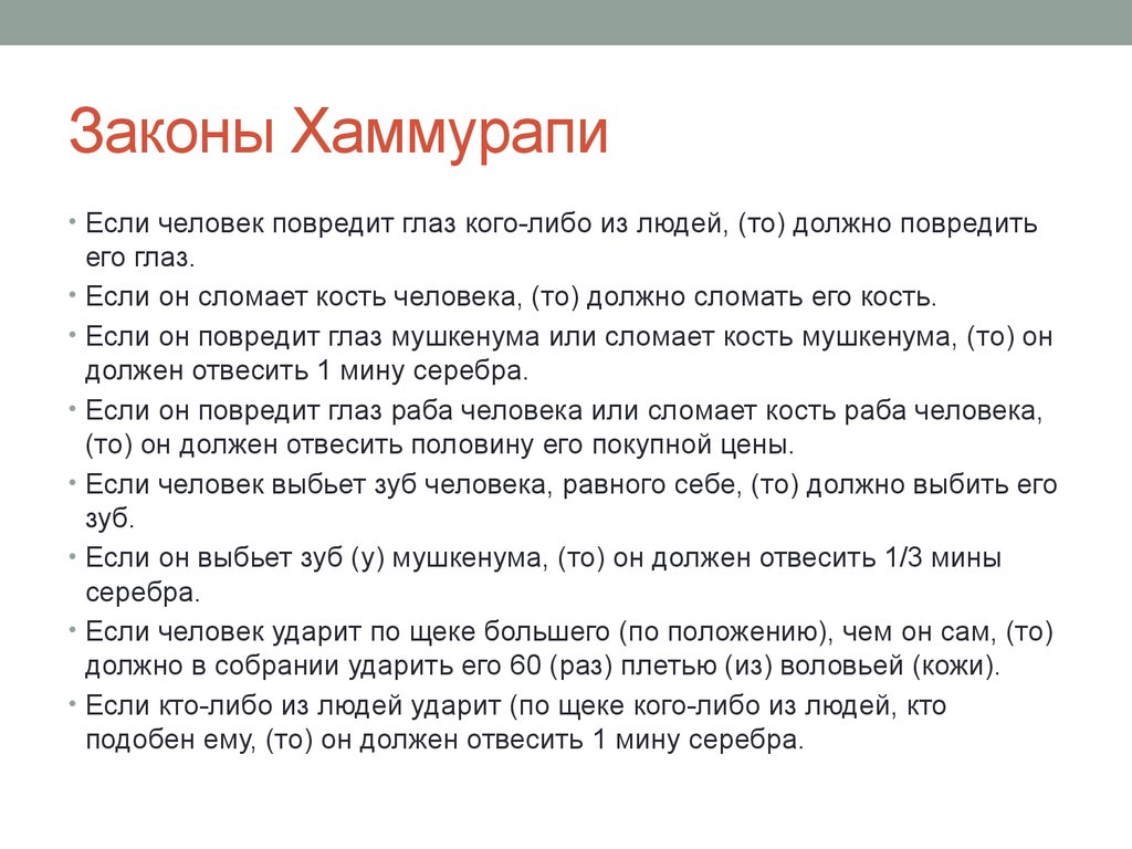 до н. э.) и представляет собой свод законов из древнего Вавилона в Месопотамии. - Кодекс состоял из 282 законов с наказаниями, которые различались в зависимости от социального статуса (рабы, свободные люди и собственники).