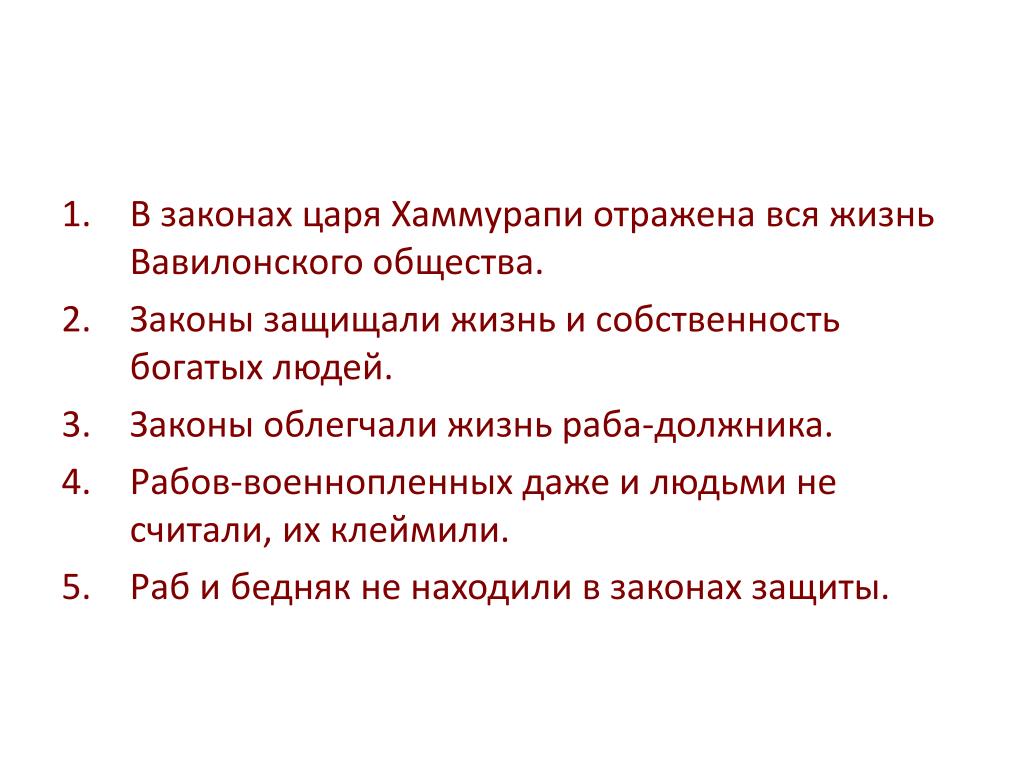 Как же объяснить такую позицию государства к людям, которые были, как нам сегодня представляется (или представлялось), рабами? Прежде всего, нужно учесть, что рабство тогда считалось карой богов, но такой, которую можно избыть, искупить. К тому же мудрый царь Хаммурапи строил правовые основы своей державы не на одних карательных мерах, а создавая личную заинтересованность граждан в устоях царства. Предоставление гражданских прав рабам (особенно дворцовым) делало их патриотами государства. Вот так.