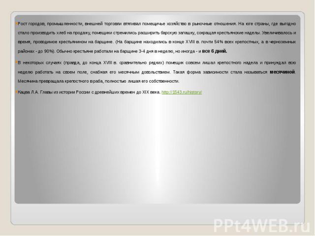 зато согласуются с выводами исследователей, специально изучавших динамику кре — стьянского надела. «Конечно, каждый исследователь, имеющий дело с первоисточ — никами, без труда укажет десятки примеров хищнического хозяйствования помещи — ков, отбиравших у крестьян наделы, доводивших их до полного разорения и нищеты. Однако эти примеры не отражают ведущих явлений в барщинной деревне Централь — ной России в первой половине XIX в. Усиление эксплуатации и ухудшение положе — ния крестьян находили свое главное выражение не в массовом обезземеливании, а в