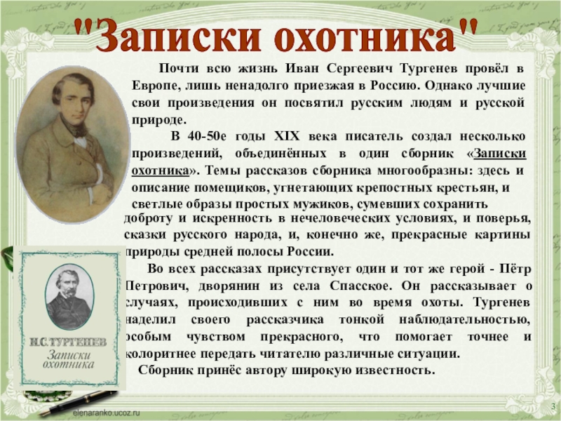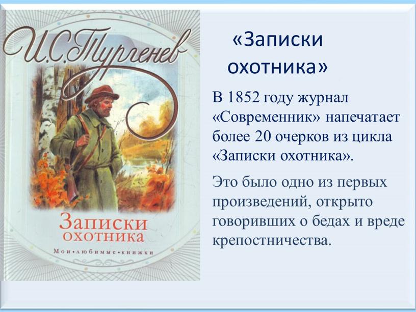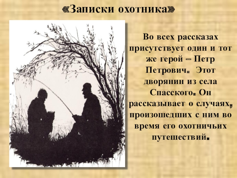 «Записки охотника» – сборник из 25-ти сравнительно коротких рассказов. Большинство из них было написано И. С. Тургеневым на рубеже 1840-1850-х годов. Здесь он повествует о встречах с людьми во время охотничьих скитаний по родной Орловщине и том, что слышал из их уст.