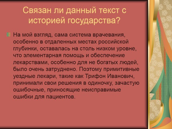 Вдруг доктор резко меняет тему рассказа. Он предлагает поговорить о чем-то другом или сыграть в преферанс. Упоминает о своей жене Акулине («Трифону-то под стать»), купеческой дочке с богатым приданым. Автор и доктор играют в преферанс. Лекарь выиграл целых два рубля и ушел довольный.
